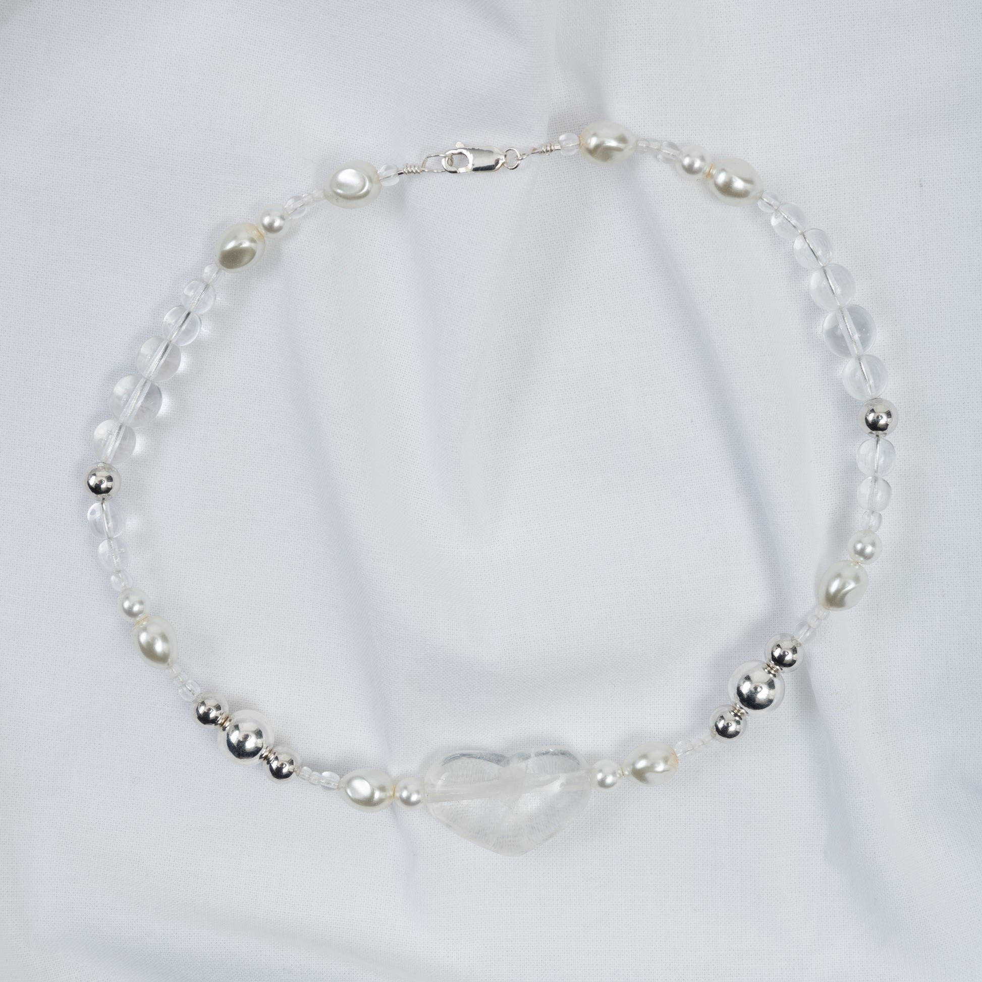 Vintage Glass & 925 Recycled Silver beads with hand-cut & polished transparent heart quartz/ mountain rock crystal stone necklace
