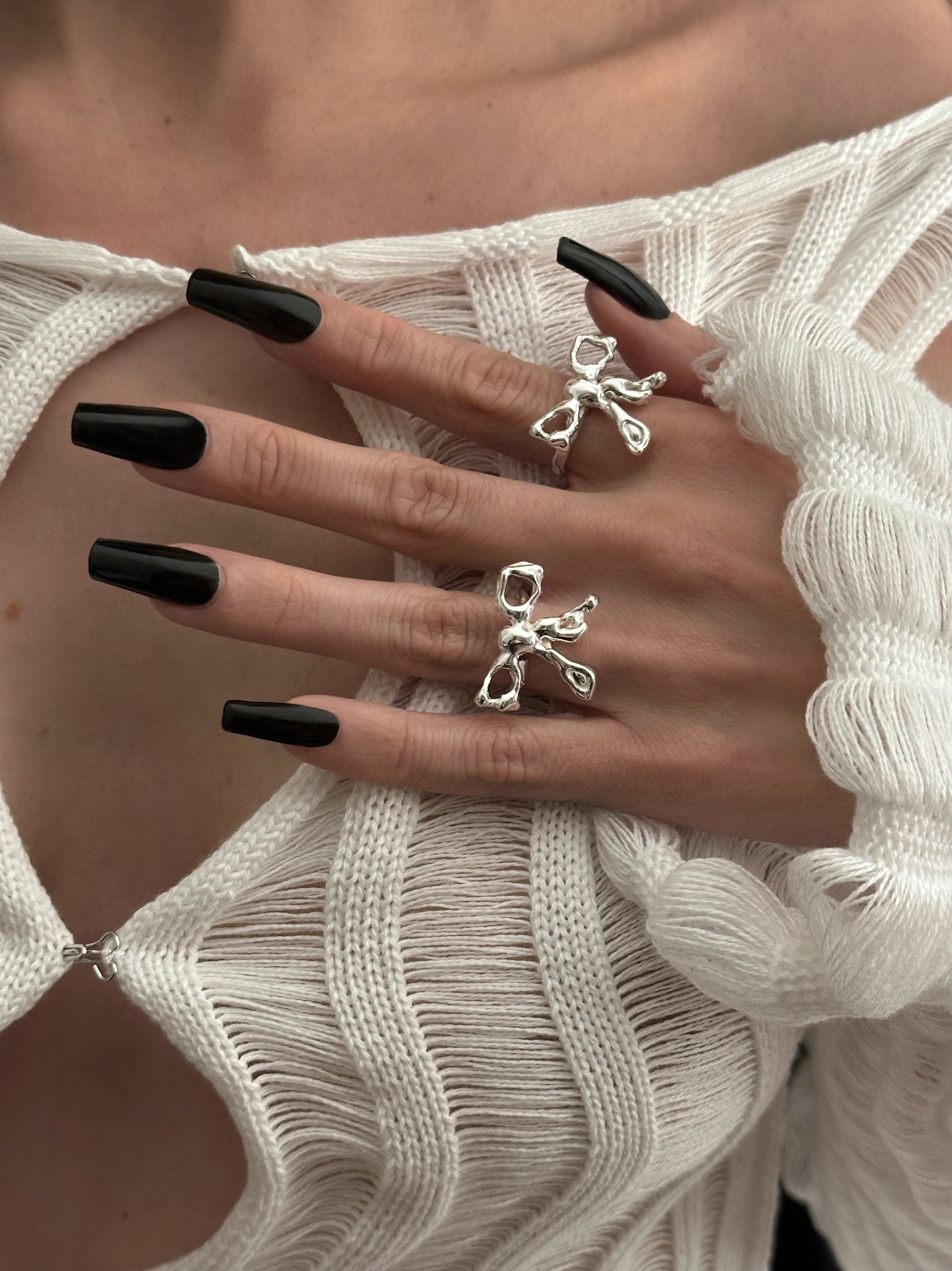 The LIQUIFIED BOW ring is handcrafted in recycled 935 silver and features a molten bow.
