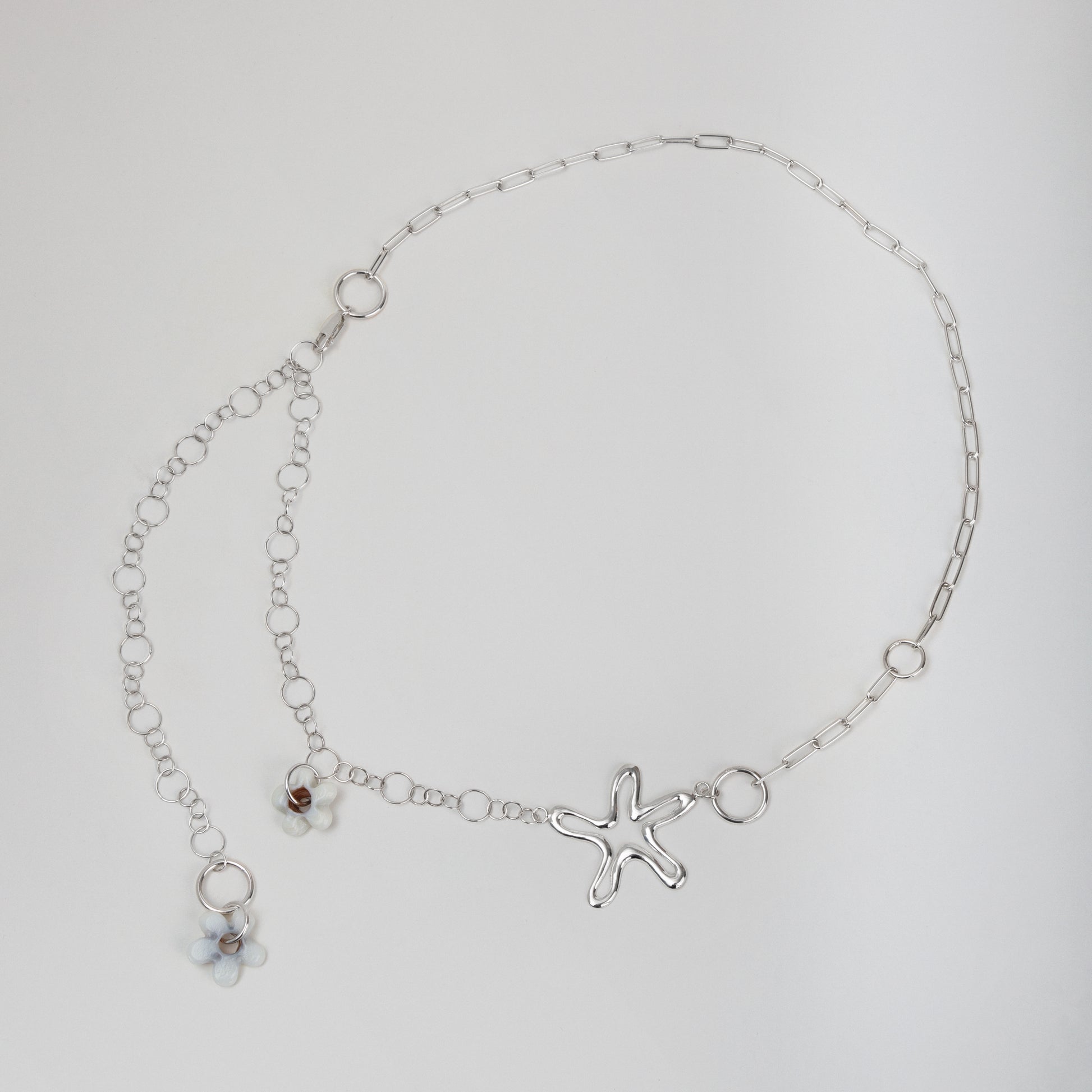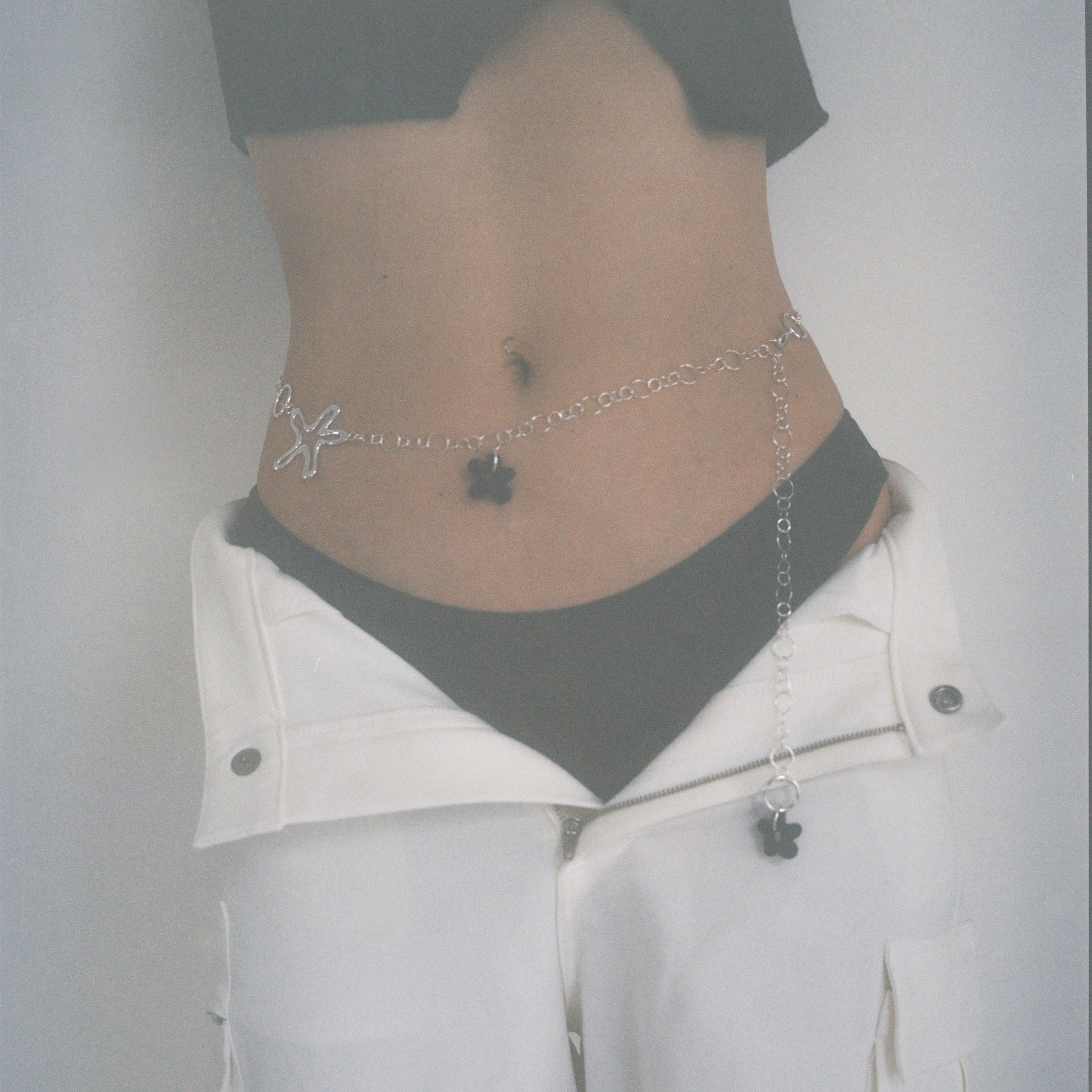 Flower Belly Chain with recycled 935 Silver or Gold Vermeil flower pendant & two Murano glass flower beads attached to a chain.