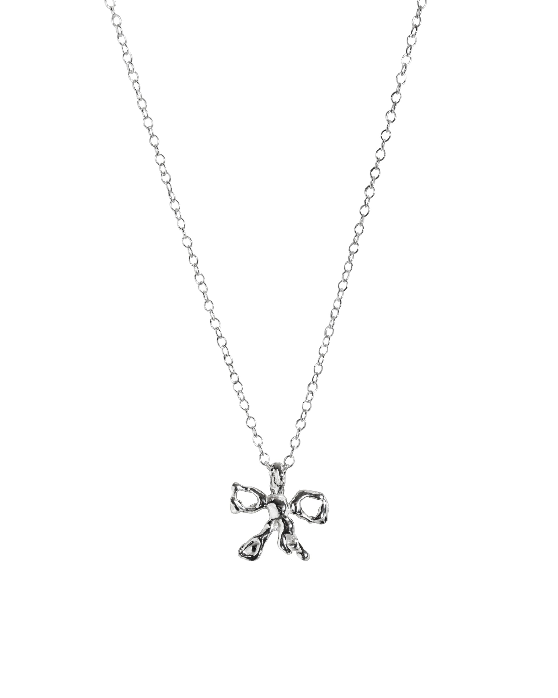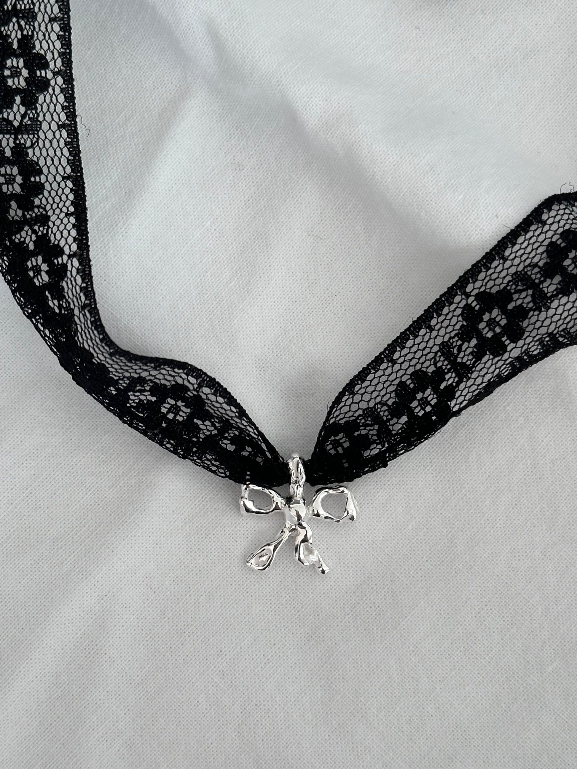 From our ETHEREAL Collection, the LIQUIFIED BOW Lace Necklace features a handcrafted small molten bow and comes with a floral lace necklace in black or a silver or gold chain.