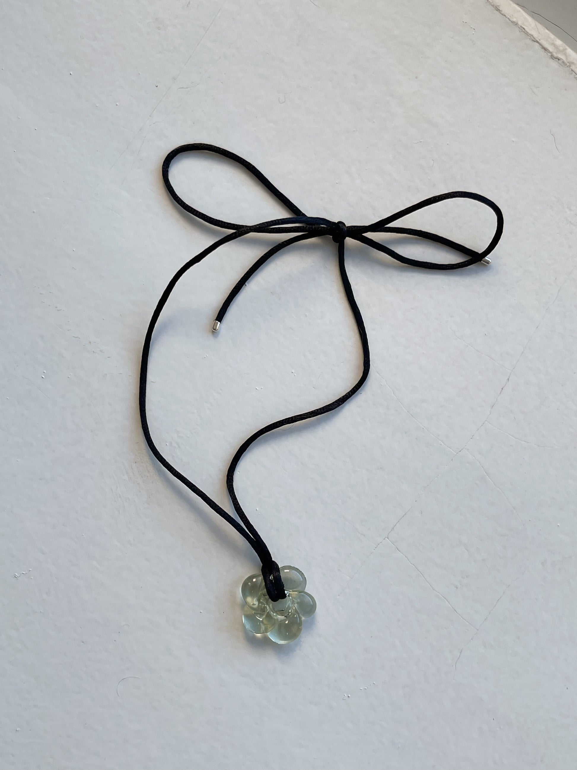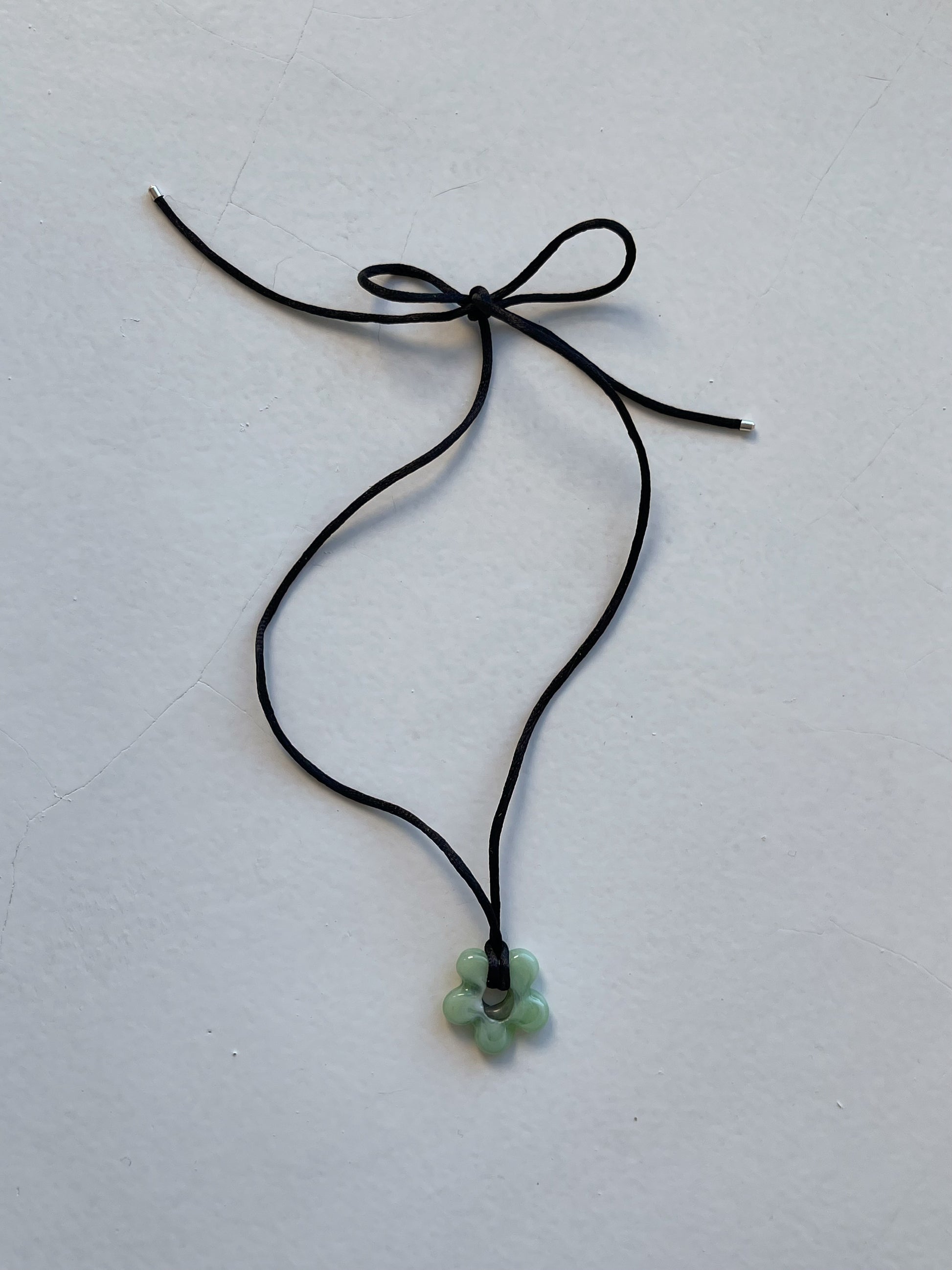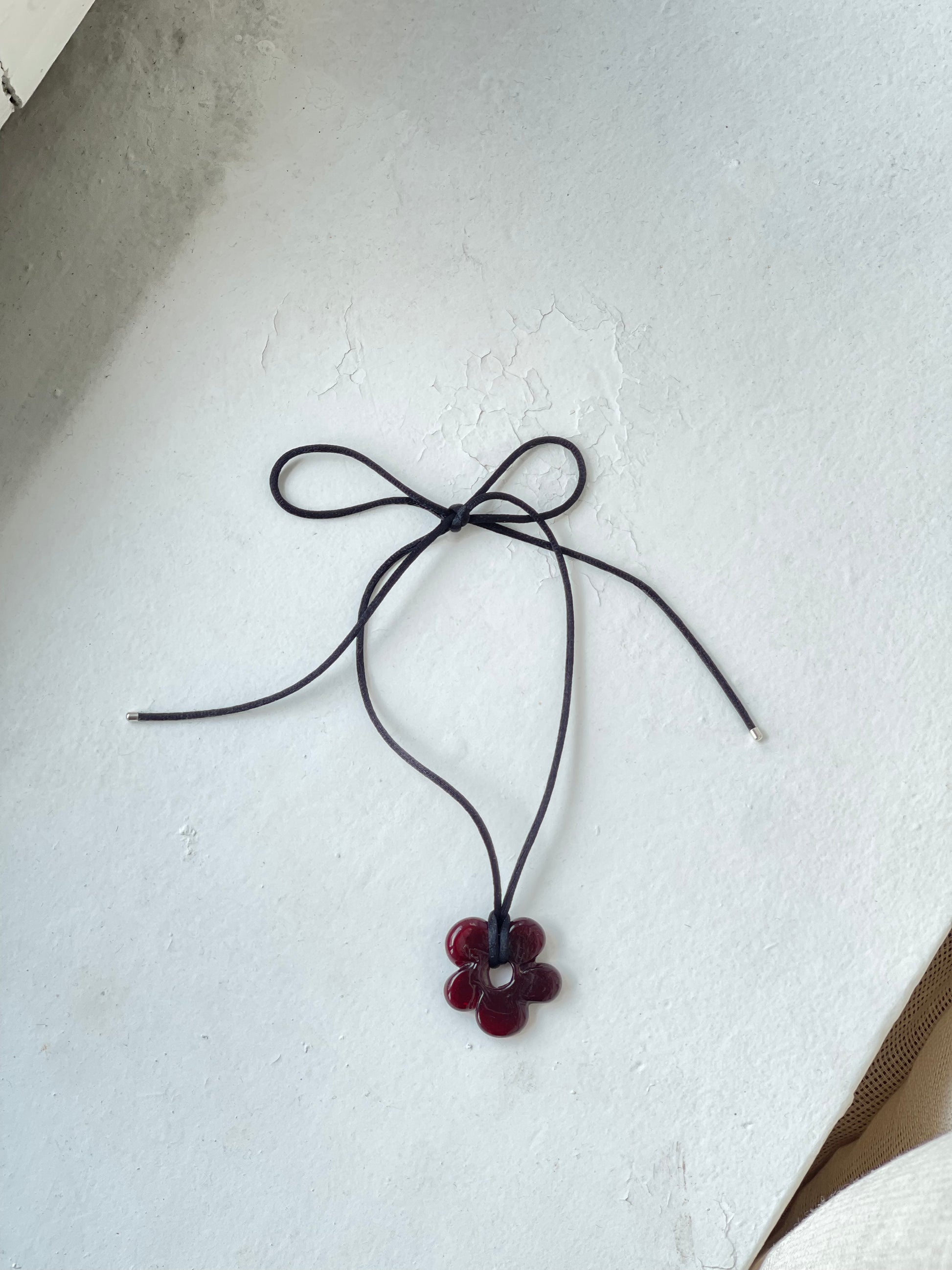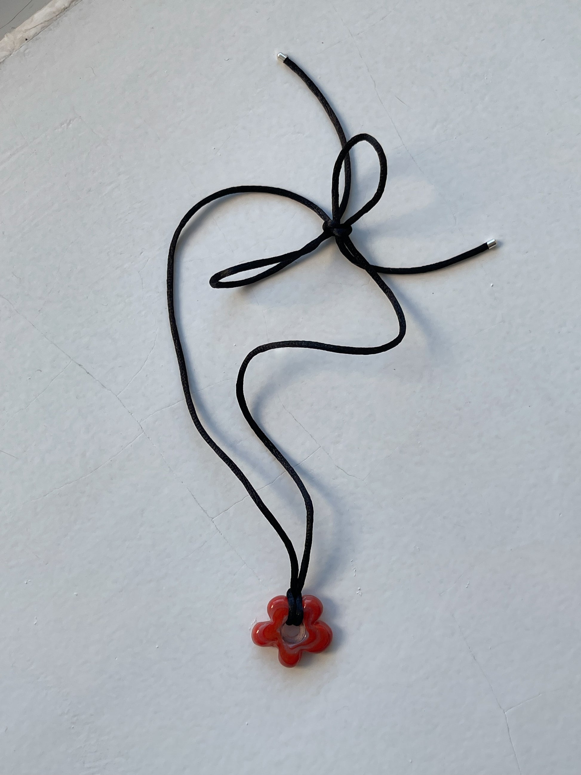 Made out of a medium sized glass flower bead attached to a vegan silky cord.