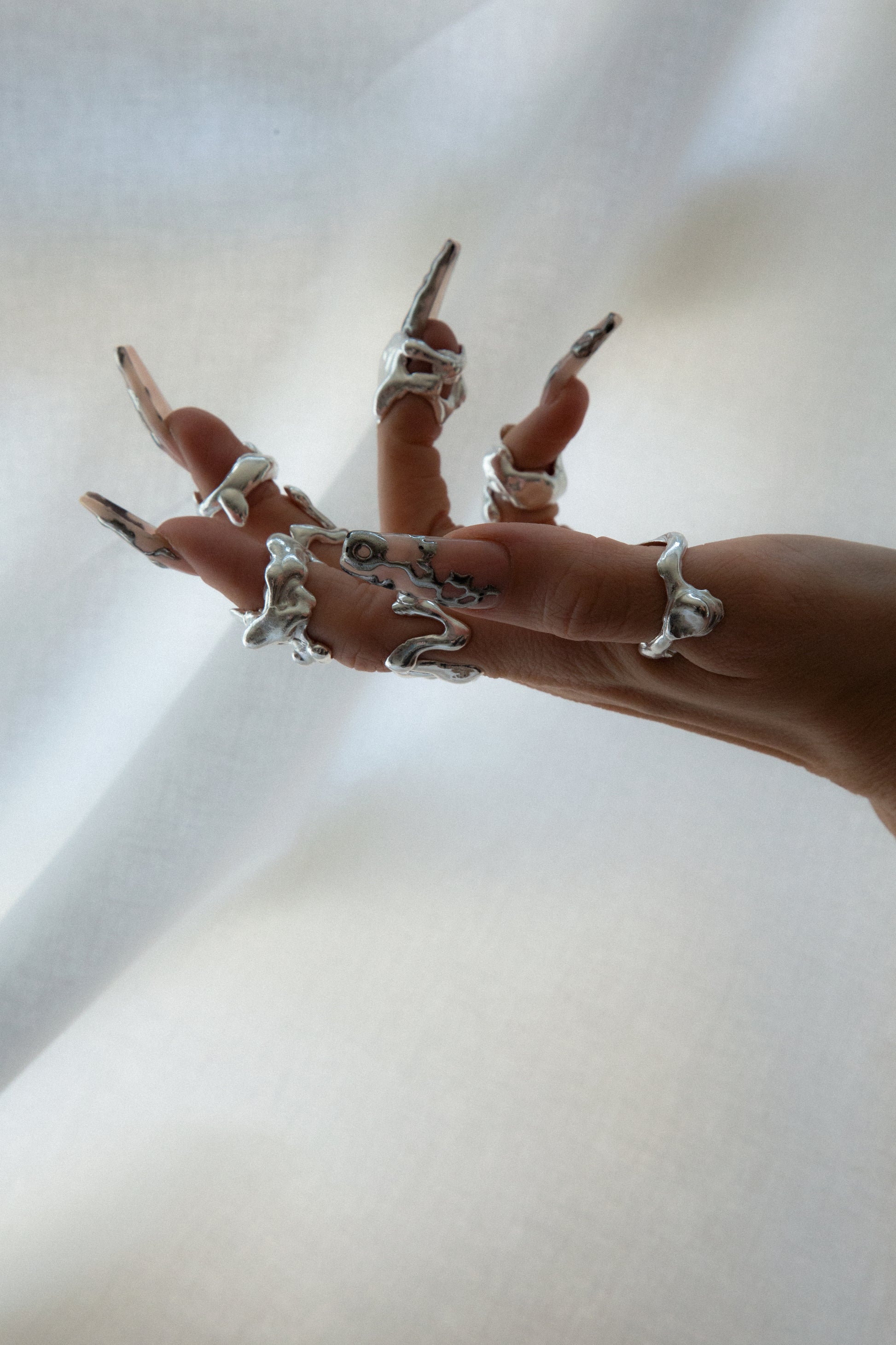 Inspired by the formation of lava from molten rock, the LAVA Ring imitates the spontaneity and unpredictability of nature. By heating the wax and dripping it with a coincidental gesture, the ring takes on an organic and natural structure, resembling the way lava flows and travels. Fascinated by the rhythms and the immensity of nature which shows strength and fragility at the same time, the LAVA Ring is part of a series of rings with different shapes and textures evoking molten substance.
